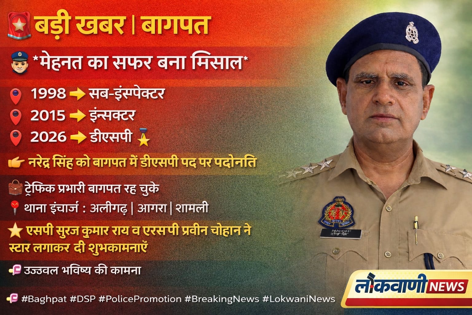 लोकवाणी बागपत || नरेंद्र सिंह, जो वर्ष 1998 बैच के सब-इंस्पेक्टर के रूप में पुलिस सेवा में शामिल हुए थे, को अब वर्ष 2026 में डीएसपी (Deputy Superintendent of Police) पद पर पदोन्नत किया गया है। उन्होंने वर्ष 2015 में…